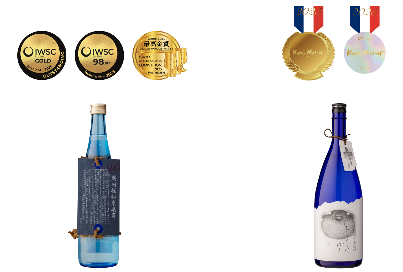 We are pleased to announce that Sakagura Ohtemon’s Imo Shochu “Kurauchi Gokuhi Ringisho” has been awarded the Outstanding Gold/ Superior Gold Medal at both the IWSC 2025 (held in the United Kingdom) and the TWSC 2025 (held in Tokyo).Additionally, we are delighted to share that our Imo Shochu “Torafugu Chingyo” has received the following honors at the Kura Master 2025 (held in France):